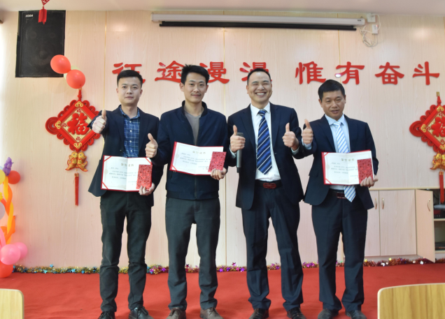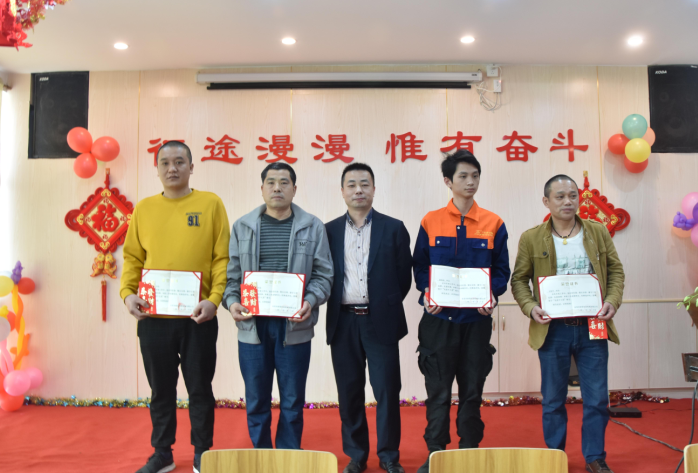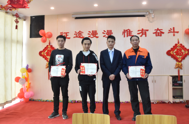 生產(chǎn)部經(jīng)理陽專為周偉群、胡勇波、李加龍、唐江明頒發(fā)先進(jìn)個(gè)人獎(jiǎng)