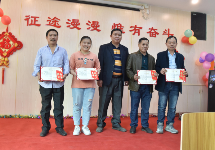 營銷部經(jīng)理伍綱強(qiáng)為邱高明、周美芳、黃榮先、龔超頒發(fā)先進(jìn)個(gè)人獎(jiǎng)