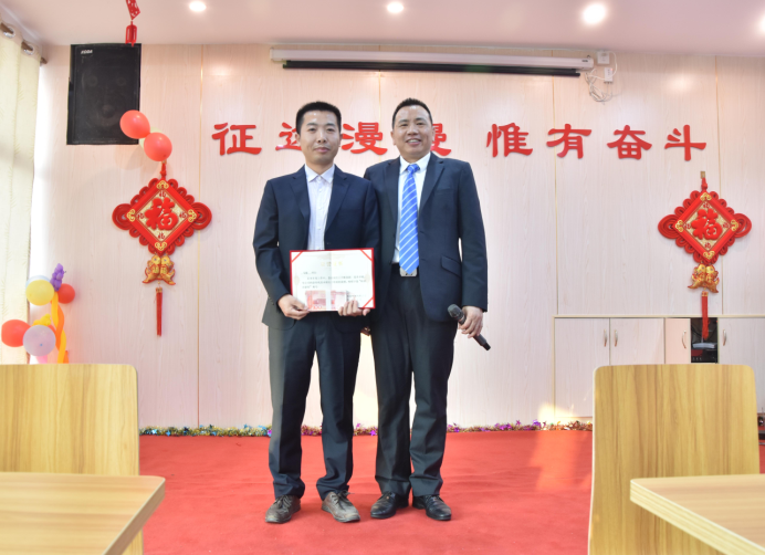 市場(chǎng)營銷部經(jīng)理羅曉明為付新民、黃文頒發(fā)優(yōu)秀管理獎(jiǎng)